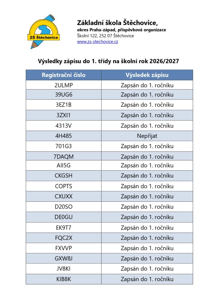 zápis k povinné školní docházce na školní rok 2026/2027 se v naší škole koná 11. února 2026 od 13 do 17:30. Informace o přijatých žácích budou zveřejněny do 11. března na webových stránkách školy, na vývěsce školy i v MŠ Štěchovice.