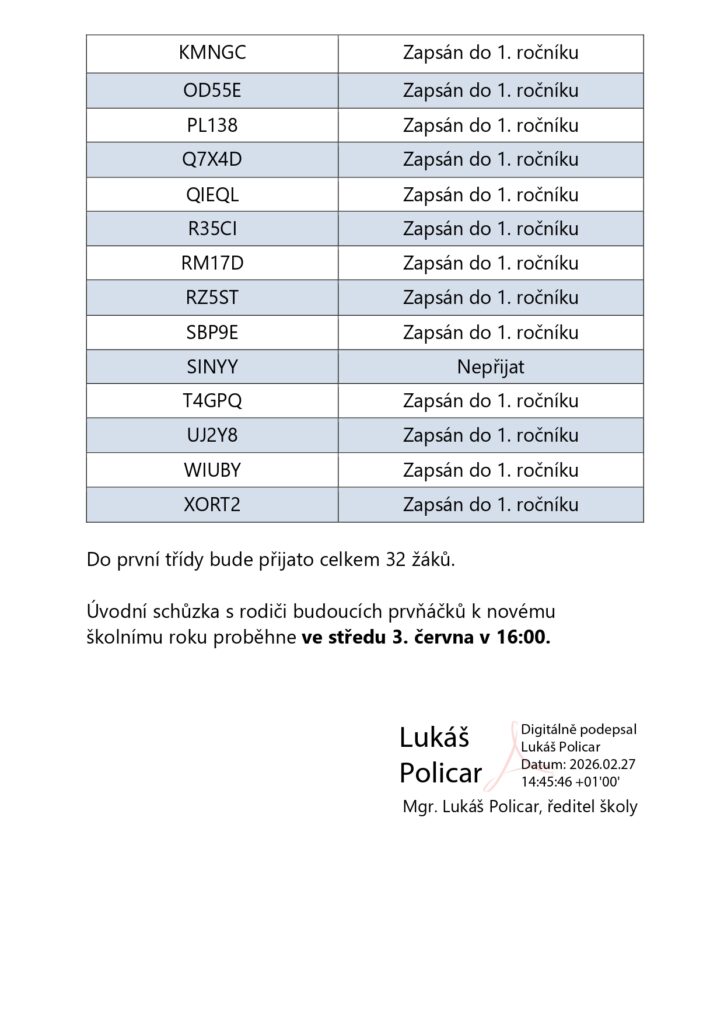 Výsledky zápisu do 1. třídy na školní rokk 2026/2027