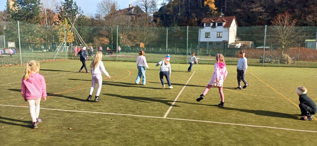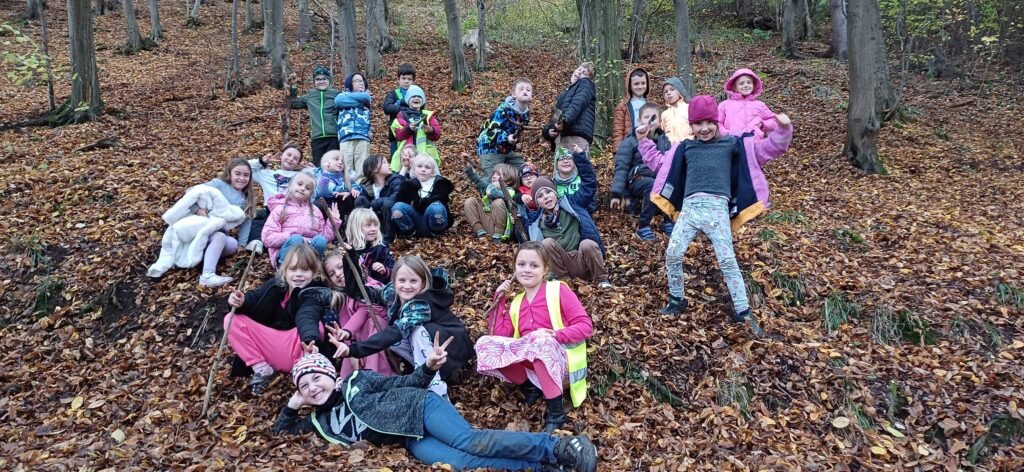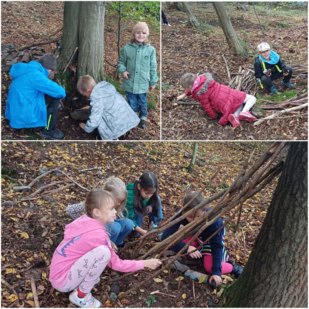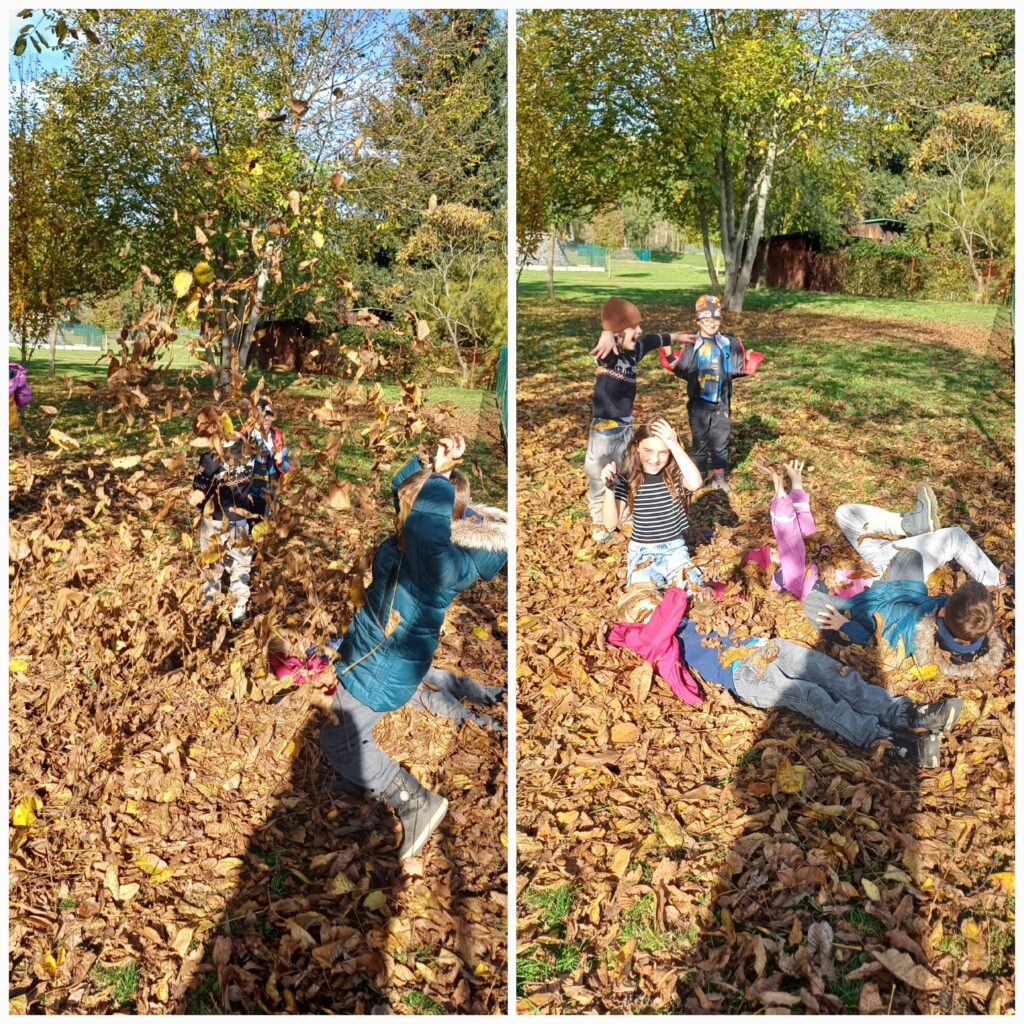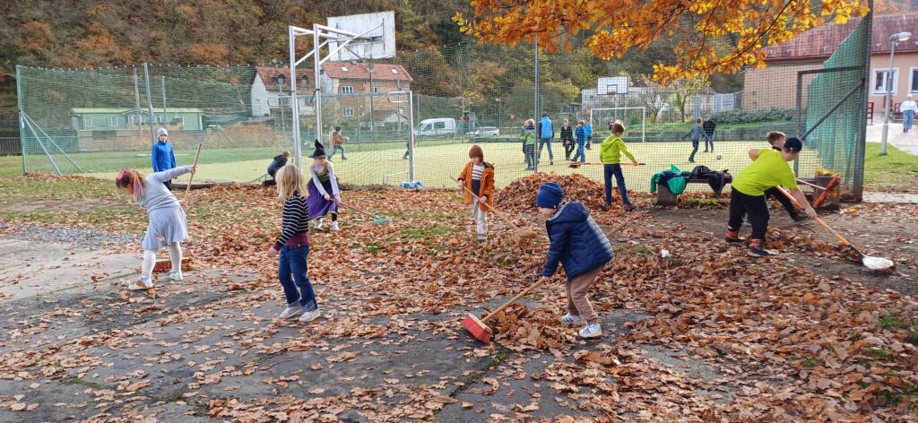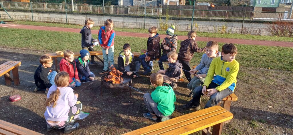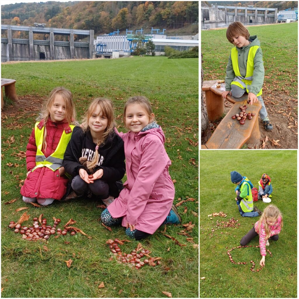 Říjen jsme zahájili jako každoročně sběrem kaštanů, kterých děti donesly celkem 120 kg. Ty jsme předali myslivcům pro zvířatka a některé použili na vyrábění. Čtvrteční vycházky nejčastěji směřovaly do lesa, kde si děti postupně dodělávaly domečky a bunkry z přírodnin. Na školním hřišti jsme k fotbalu a vybíjené přidali i florbal, který si oblíbili zejména chlapci. V listopadu jsme udělali náš tradiční ohýnek a opékali buřtíky.