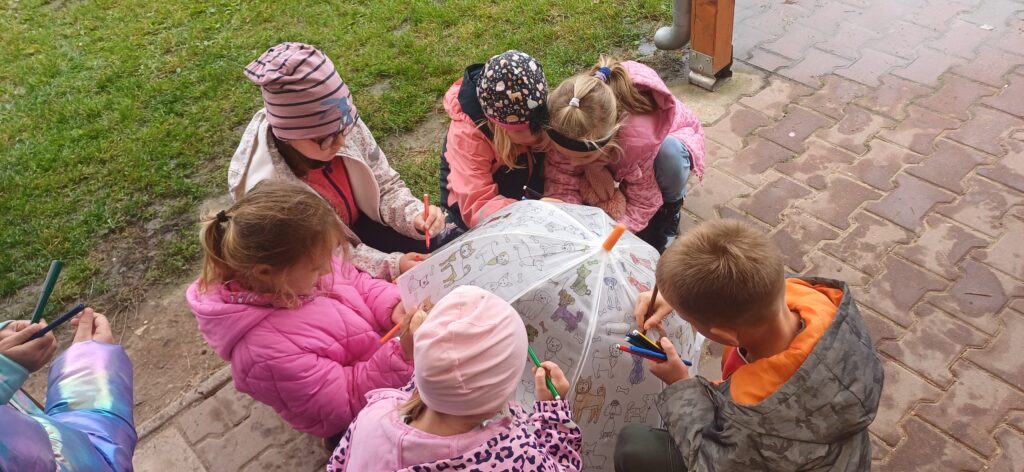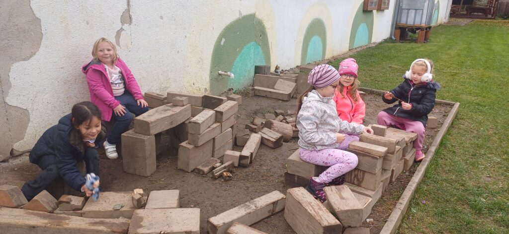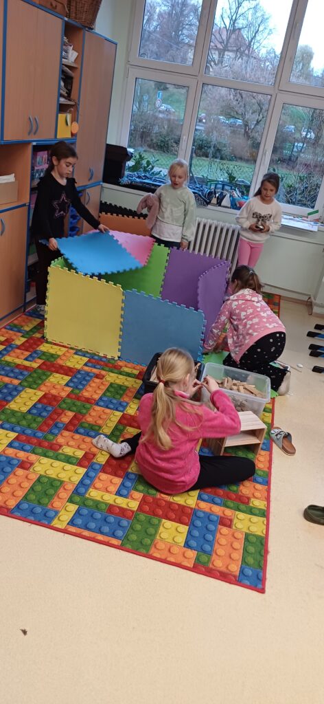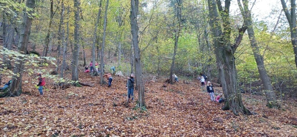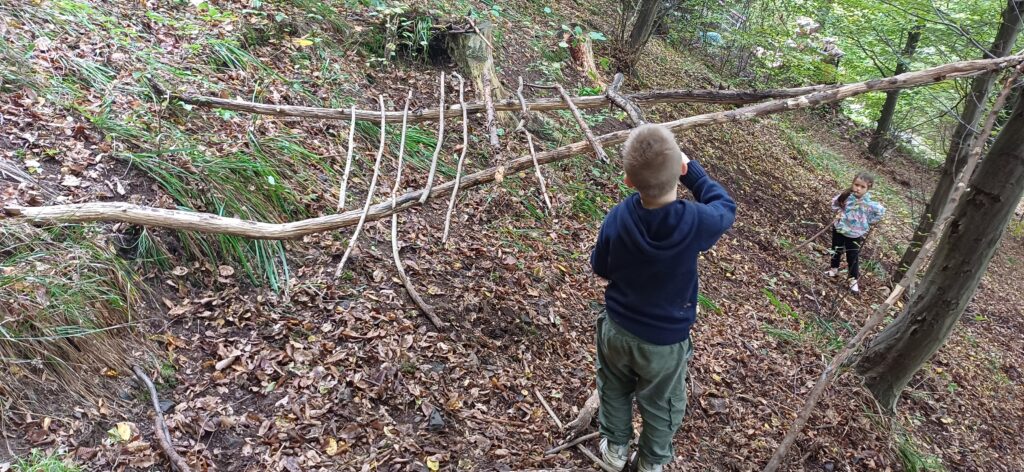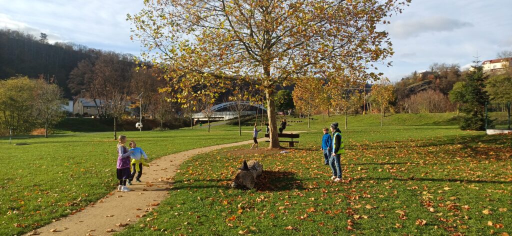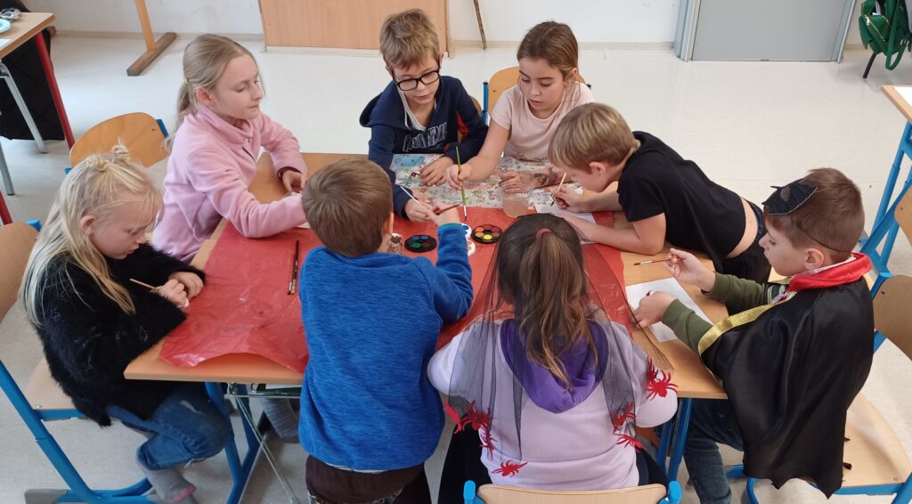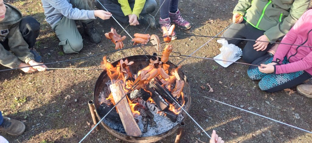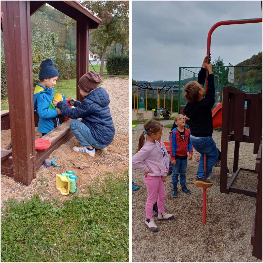 Říjen jsme zahájili jako každoročně sběrem kaštanů, kterých děti donesly celkem 120 kg. Ty jsme předali myslivcům pro zvířatka a některé použili na vyrábění. Čtvrteční vycházky nejčastěji směřovaly do lesa, kde si děti postupně dodělávaly domečky a bunkry z přírodnin. Na školním hřišti jsme k fotbalu a vybíjené přidali i florbal, který si oblíbili zejména chlapci. V listopadu jsme udělali náš tradiční ohýnek a opékali buřtíky.