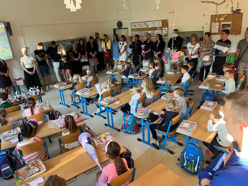 První školní den byl pro naše nové prvňáčky plný radosti, očekávání a milých překvapení. Slavnostního přivítání se ujala paní starostka spolu s vedením školy, kteří dětem popřáli mnoho úspěchů a krásných zážitků. Každý prvňáček obdržel od školy uvítací balíček s pomůckami a knihu od obce, jako dárek na památku.